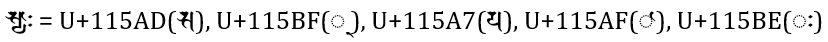𑖭𑖿𑖧𑖯𑖾 = U+115AD(𑖭), U+115BF(𑖿 ), U+115A7(𑖧), U+115AF(𑖯), U+115BE(𑖾)